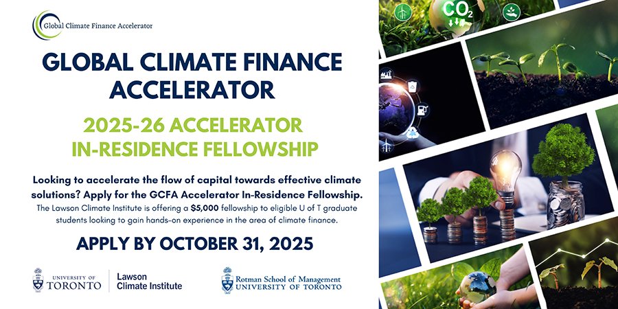 The Global Climate Finance Accelerator is currently inviting applications for the 2025-26 Accelerator In-Residence Fellowship available to multi-disciplinary graduate students for the 2025–2026 academic year. These fellowships are generously supported by the Brian and Joannah Lawson Family Foundation and the University of Toronto’s Lawson Climate Institute.